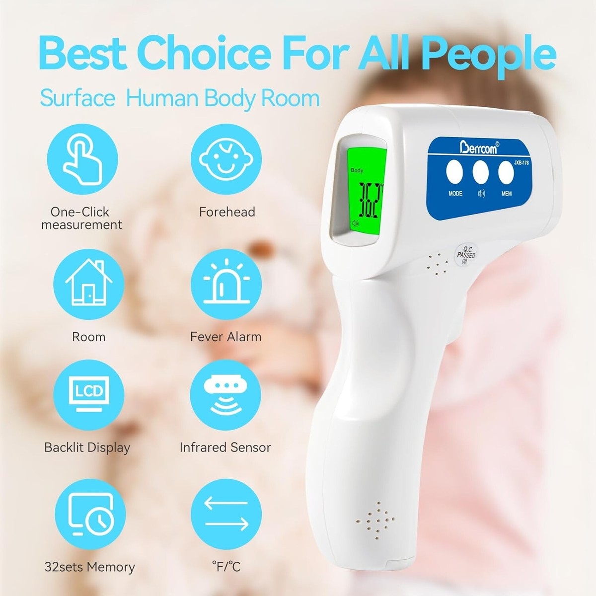 Berrcom Non Contact Infrared Forehead Thermometer JXB-178 Baby Fever Check Thermometer 3 in 1 Contactless for Kids Infant Adult (Batteries Not Included)